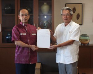 市総合計画の基本構想を座喜味市長に答申する下地会長(左)=4日、市役所