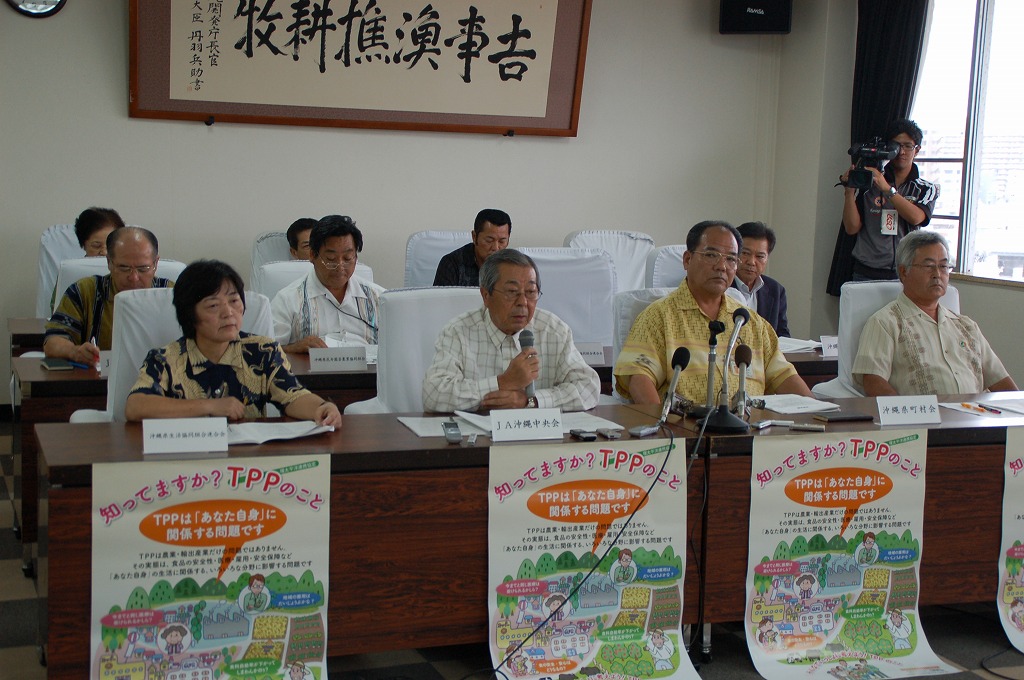 TPP交渉参加に徹底反対することを表明した小那覇会長(前列左から2人目)=31日、那覇市、JA会館