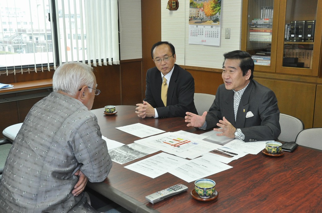 下地敏彦市長に宮古島産マンゴーの海外販売を提案する中嶋茂さん(右)=15日、市役所平良庁舎
