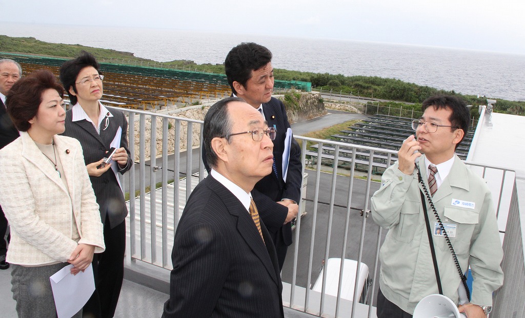 実証研究設備について担当者から説明を聞く委員ら=19日、宮古島メガソーラー実証実験施設