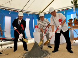 くわ入れで工事の安全を祈願する下地市長(中央)と川崎技研の田中基壹社長(左)、沖縄チャンドラーの福田利夫社長=10日、平良西仲宗根