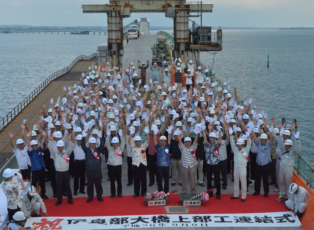 大橋が一つにつながったことを祝して関係者全員で万歳三唱を行った=9日、伊良部大橋
