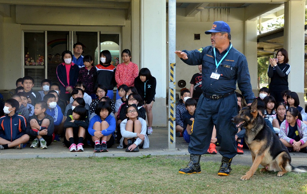 災害救助犬の実演にくぎ付け。犬に寄り添う幸喜さん=3日、下地小学校